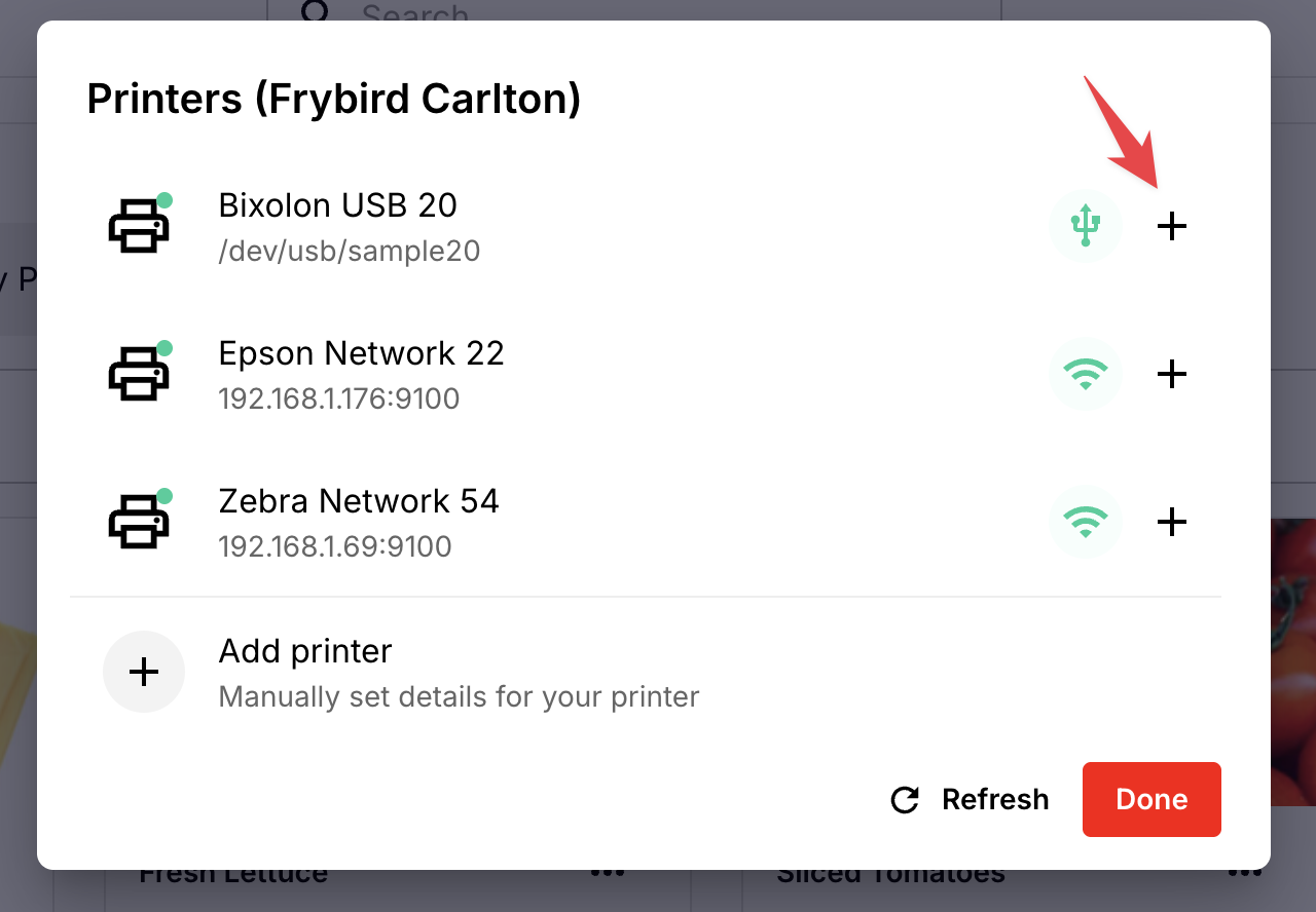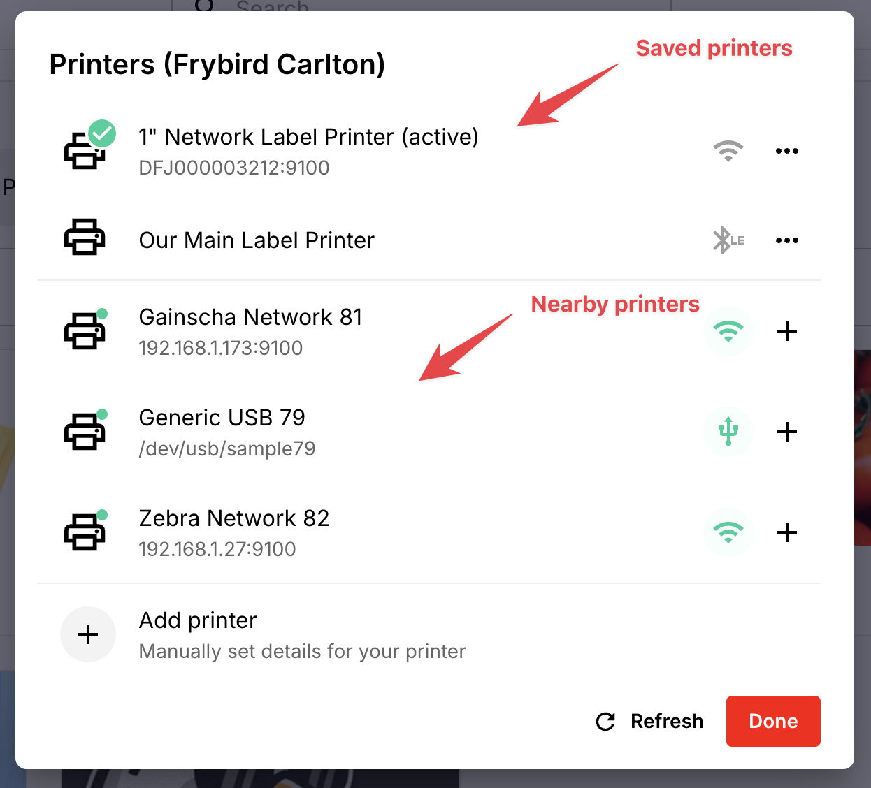 - Complete any additional details and click Save printer - your newly saved printers appear at the top of the printer selection screen for your location