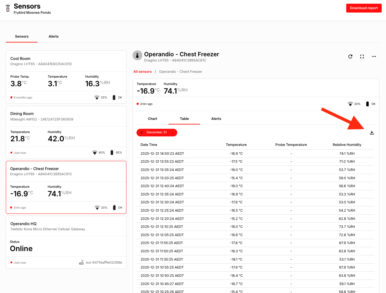 At this stage, sensor data can only be downloaded per sensor, per day and is available in CSV format.