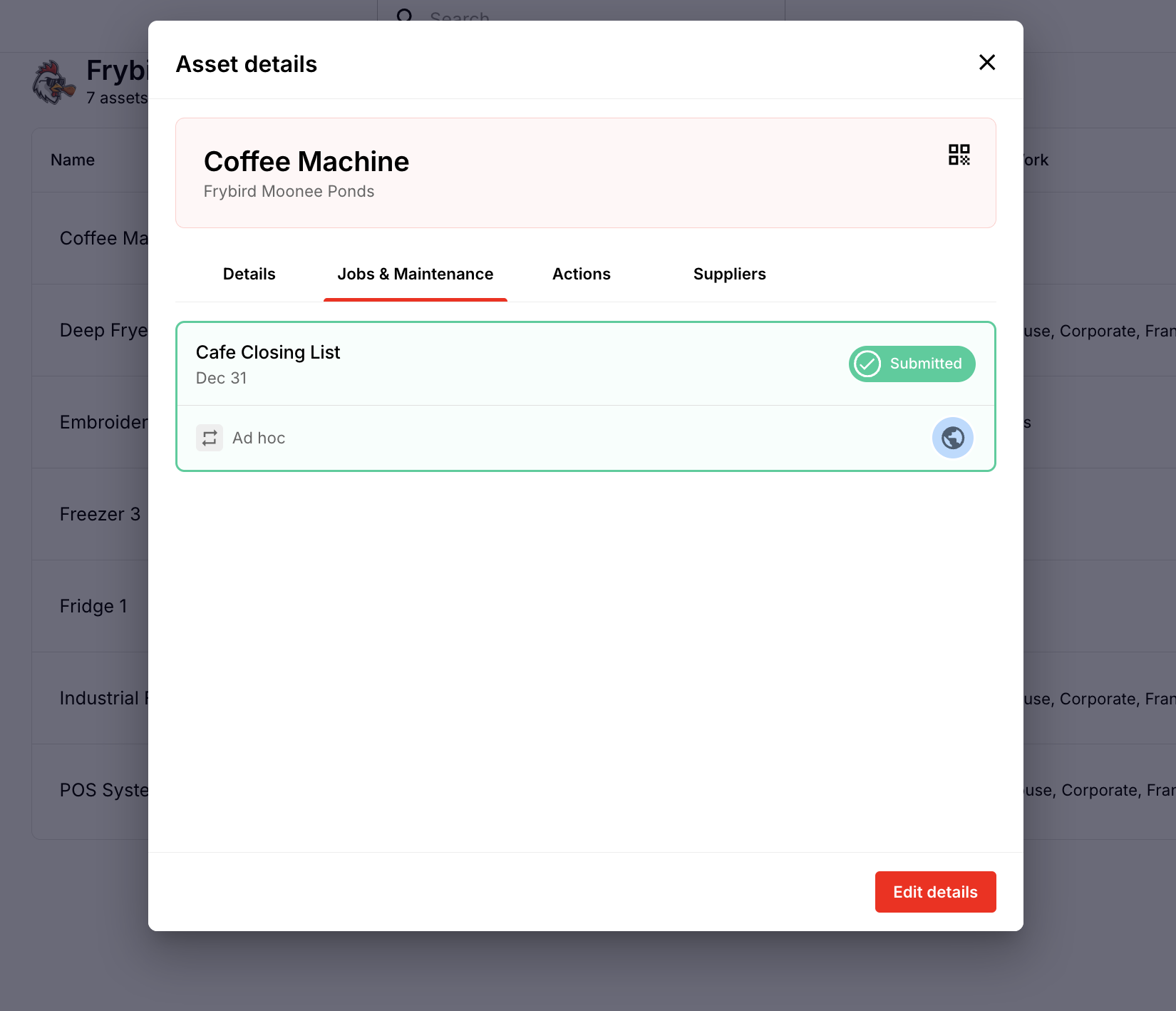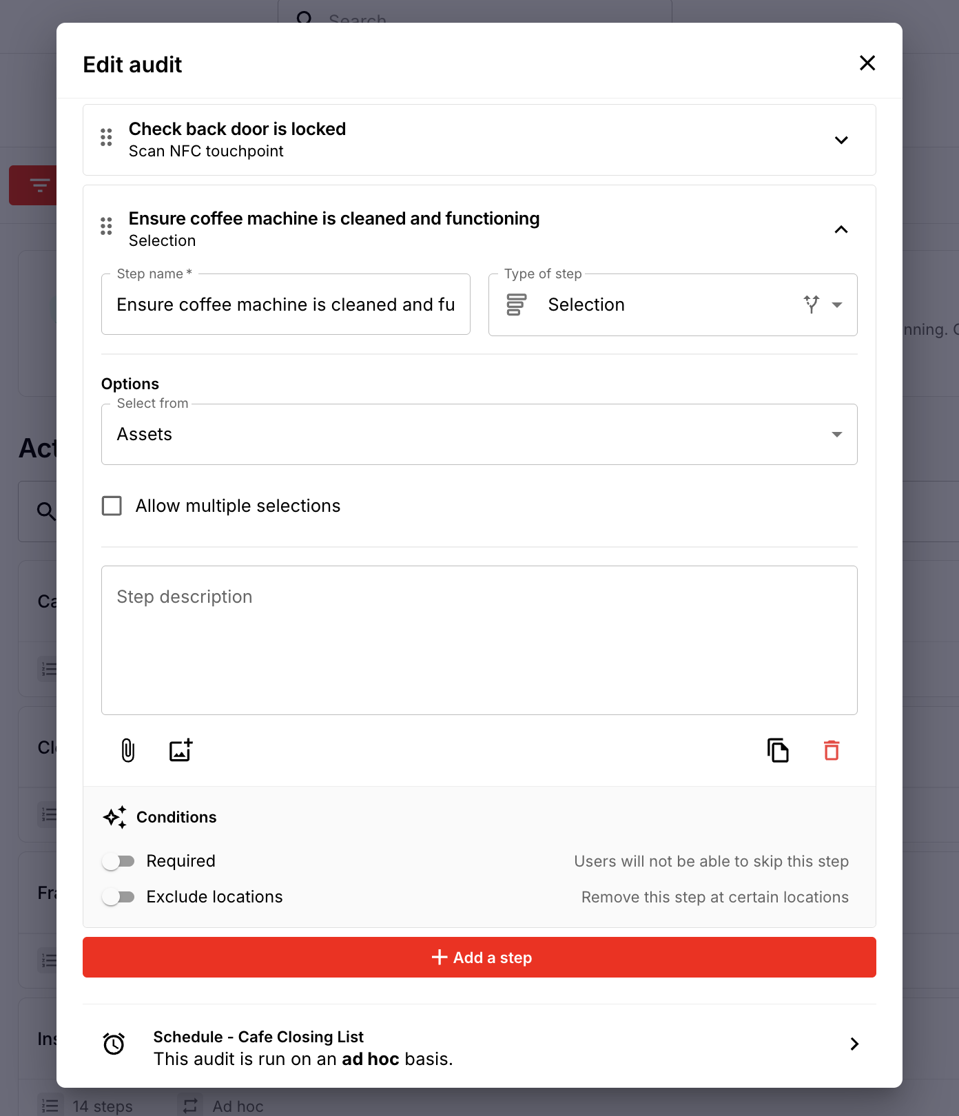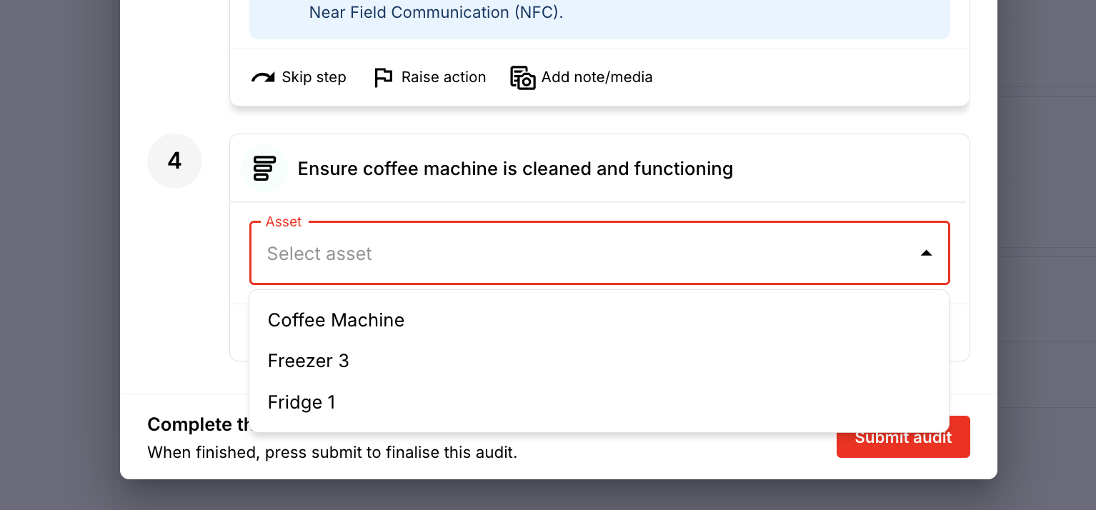Example: A Maintenance Check job may require staff to select a specific coffee machine or piece of kitchen equipment before completing the inspection form.
