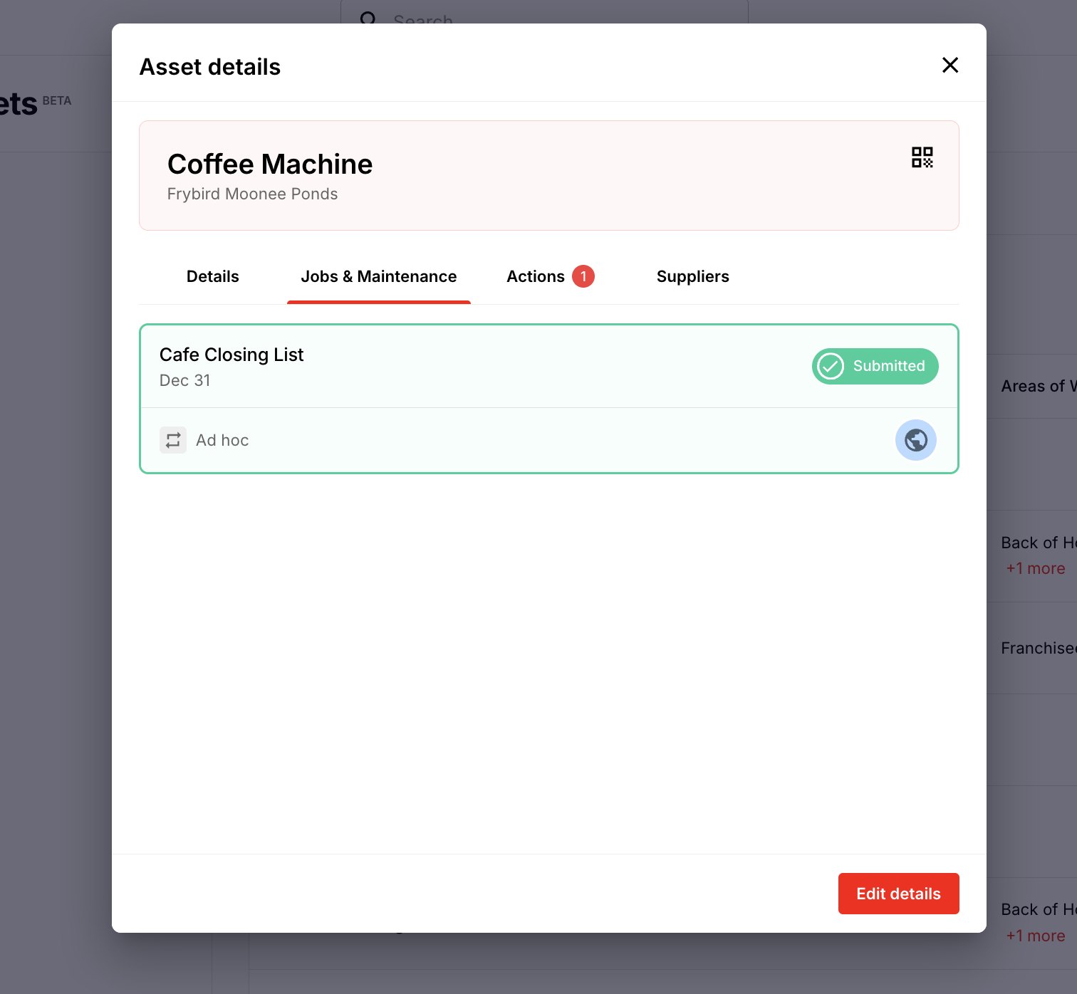 - The Jobs & Maintenance section lists any jobs where the asset has been selected using the asset response type.