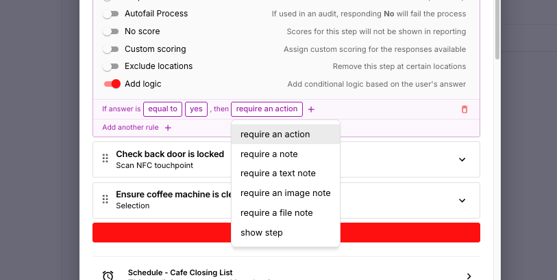 Conditional logic allows you to create dynamic checklists, audits, and tasks that adapt based on user responses. This functionality ensures that the right actions, notes, or extra steps are triggered automatically, making your workflows more efficient and actionable.