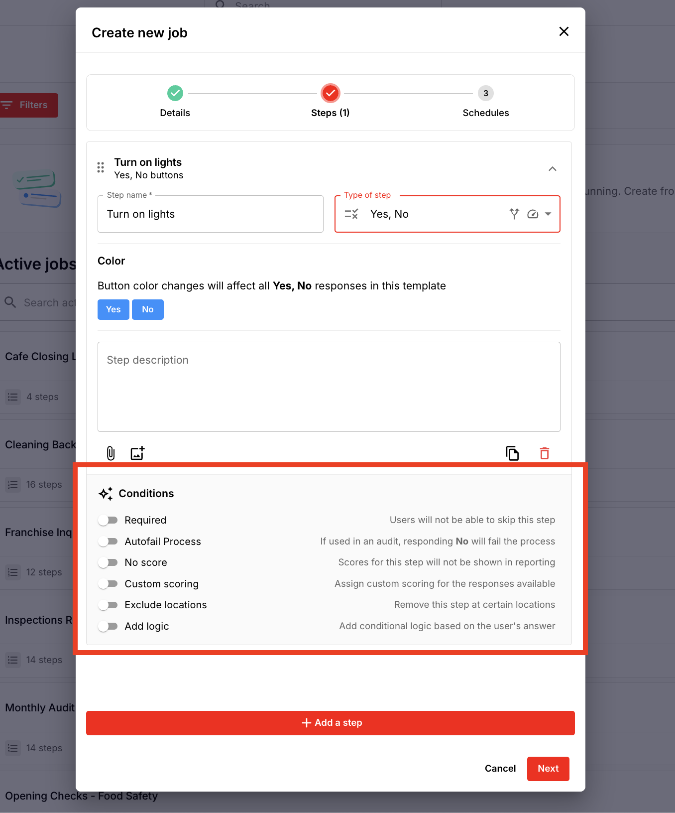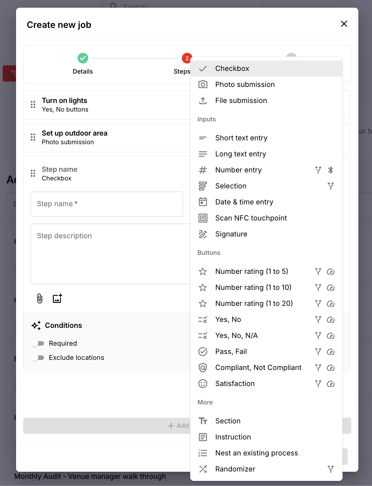| Required | Users will not be able to skip this step. Example: A food safety check step is marked as required to ensure it is always completed. |
